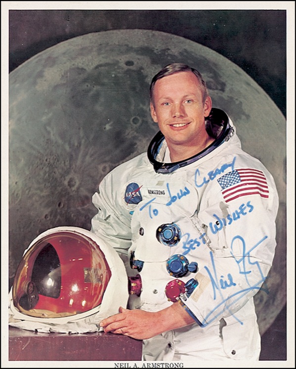 Color 8 x 10 NASA photo of Armstong posing in his spacesuit against a lunar background, signed and inscribed in blue felt tip “To John Cleary, Best wishes, Neil Armstrong.” In very fine condition. COA Scott Cornish and R&R COA.