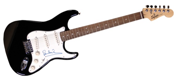 Black-bodied Fender Squier ‘stratocaster-style’ electric guitar, nicely signed in-person in blue felt tip on the white pickguard by McCartney. Obtained in-person by New York City collector Blake Levine, and accompanied by a candid photo of McCartney taken at time of signing. In fine condition. As nice a signed McCartney guitar as you will see. COA Roger Epperson/REAL and R&R COA. Oversized.