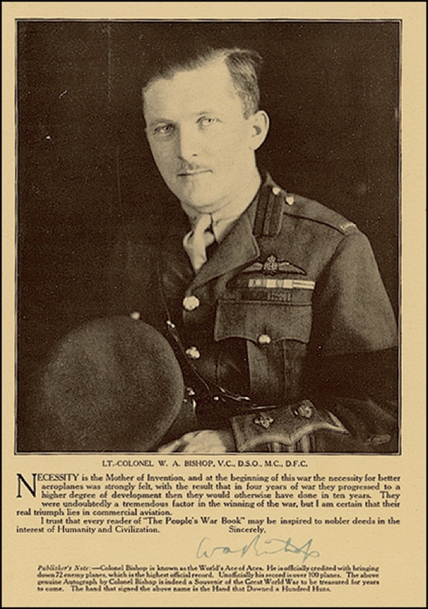 Highly decorated Canadian ace (1894–1956) officially credited with seventy-two victories in World War I. Book photo with printed biographical information, 7 x 10, signed in ink below the image, “W. A. Bishop.” The printed caption notes that “The hand that signed the above name is the Hand that Downed a Hundred Huns.” In fine, bright condition. R&R COA.