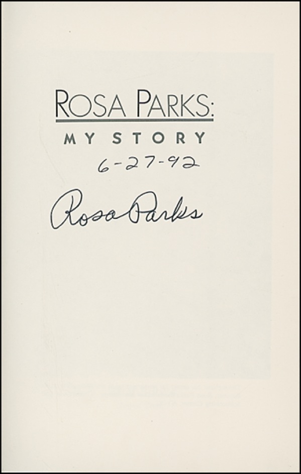 Signed book: My Story. NY: Dial Books, 1992. Hardcover with dustjacket, 6 x 8.5, 192 pages. Signed in black felt tip on the title page “6/27/92, Rosa Parks.” In fine condition. R&R COA.