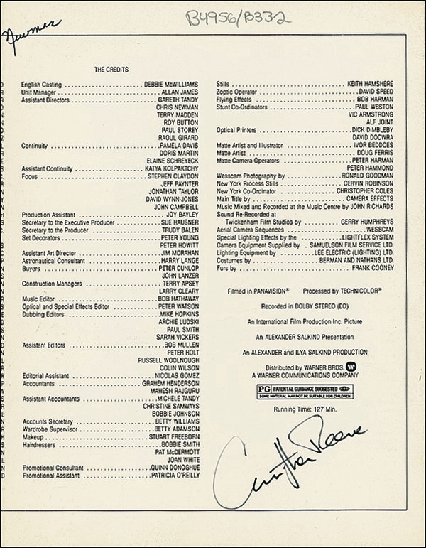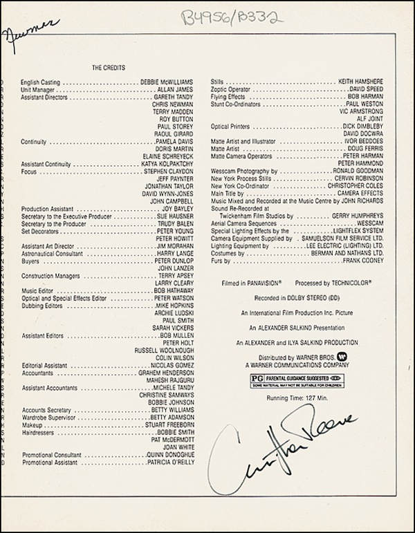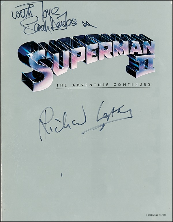 Press kit folder for Superman II, 8.5 x 11, signed inside in black felt tip by Reeve, also signed inside in felt tip by screenwriters David and Leslie Newman, and on the front cover by director Richard Lester and co-star Sarah Douglas. In fine condition, with light handling wear and a couple of corner tip dings. R&R COA.