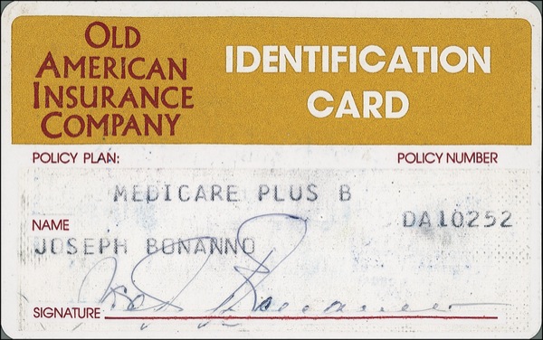 Mobster (1905–2002) who became boss of one of the most prominent crime families in the world. Bonanno’s credit-card-style membership card from the Old American Insurance Company, signed on the front in ballpoint. Accompanied by a certificate of authenticity signed by Bonanno’s daughter-in-law, Rosalie Bonanno. In very good condition, with light scattered soiling and bottom edge of signature written on the shiny surface of the card (that portion of the ink no longer adhering). R&R COA.