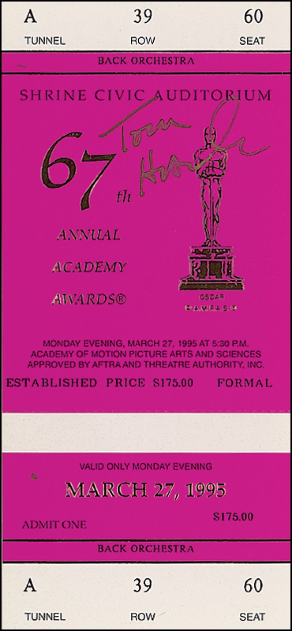 Two items: Original program booklet from the 67th Annual Academy Awards, 1995, signed on the cover in gold ink “Tom Hanks”; and an original ticket from the same event with intact stub, signed in gold ink. This was the ceremony at which Hanks received his second consecutive Oscar as Best Actor, for his performance in Forrest Gump. A hint of subtle edge wear to booklet, otherwise very fine condition. R&R COA.