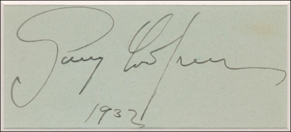 Vintage fountain pen signature, “Gary Cooper,” on a light green album page, dated 1932. Double matted with a great photo of Cooper from High Noon, to an overall size of 12 x 16. Accompanied by a letter of authenticity from PSA/DNA. In fine condition. PSA/DNA Auction LOA and R&R COA.