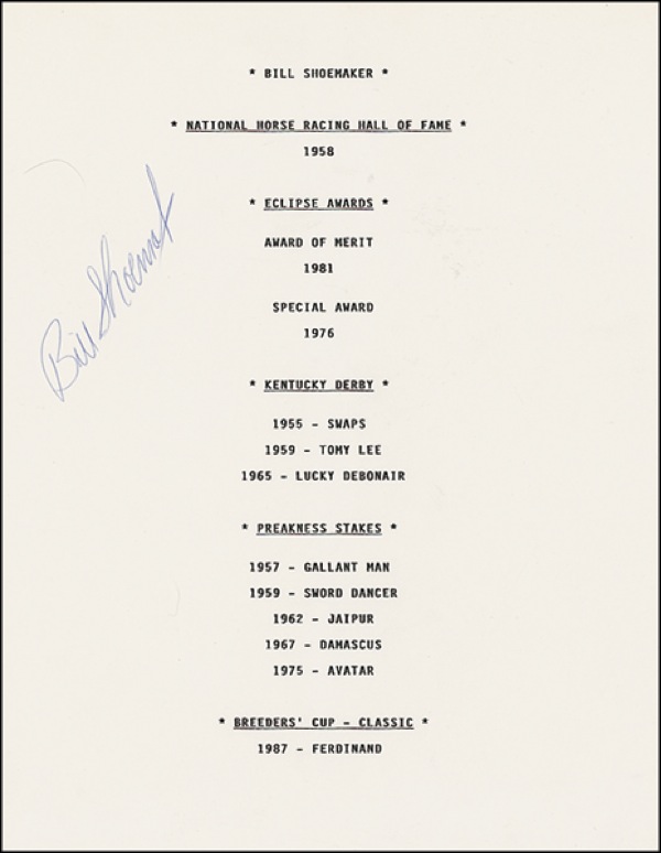 Two items: commemorative cover, with a color silk cachet of Shoemaker, signed on the front in blue ballpoint; and a ballpoint signature on an off-white 8.5 x 11 sheet with Shoemaker’s career achievements printed upon it. In fine condition. R&R COA.