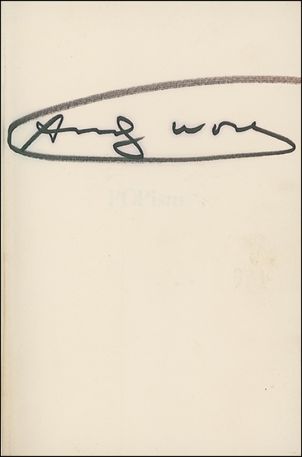 Signed book: POPism: The Warhol ’60s. NY: Harcourt Brace Jovanovich, 1980. Hardcover with dustjacket, 6.5 x 9.5, 310 pages. Boldly signed in black felt tip on the front free end page “Andy Warhol” and signed again on the jacket “Andy.” A hint of very subtle soiling to book and just a trace of rubbing to jacket, otherwise fine, clean condition. Get it for less than .0001% of Andy’s present auction record for a painting! R&R COA.