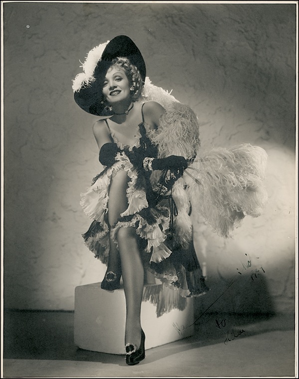 Vintage matte-finish 11 x 14 photo of Dietrich showing off her legs and wrapped in a feather boa, signed and inscribed in fountain pen “Marlene Dietrich 1959 to Helen.” In very good condition, with Dietrich’s signature very light, but mostly legible, some scattered light silvering, and a few surface marks. R&R COA.