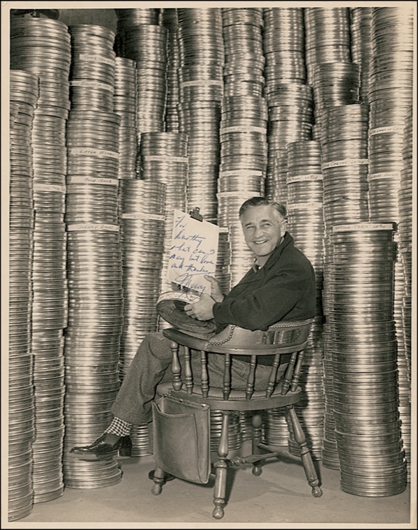 Oscar-winning American director (1900–1987) of such classics as I Am a Fugitive from a Chain Gang and The Bad Seed and producer of The Wizard of Oz. Matte-finish 11 x 14 photo of LeRoy seated in front of mountains of film cannisters, signed and inscribed in blue ballpoint “For Dorothy, What can I say but love and thanks, Mervyn.” In fine condition, with a few small creases and edge dings. R&R COA.
