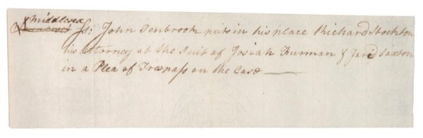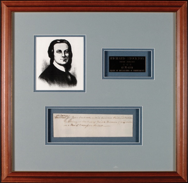 American lawyer and statesman (1730–1781) and Signer of the Declaration of Independence from New Jersey. Rare ADS, signed in the text “Richard Stockton,” one page, 7.25 x 2, no date. A legal document. In full: “Middlesex: John Tenbrook puts in his place Richard Stockton his attorney at the suit of Josiah Furman & Jared Saxson in a Plea of Trespass on the case.” Matted and framed with an engraved plaque and portrait to an overall size of 17.75 x 17.25. Very faint vertical folds (one touching last letter of first name), otherwise clean, fine, bright condition. In his 1995 reference History Comes to Life, Kenneth Rendell places Stockton’s autograph material into the “very rare” category among the Signers—an echelon second only to that occupied by the virtually unobtainable Gwinnett and Lynch.Auction LOA John Reznikoff/PSA/DNA and R&R COA.