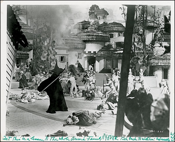 Glossy 10 x 8 photo from The Wizard of Oz, signed and inscribed in green felt tip, “Let this be a lesson to the whole Aumé Family! Never talk back to witches! Especially WWW.” In very good condition, with scattered bends, dings, and surface marks, light water stains at lower corners, and a few small smudges and runs to writing. R&R COA.