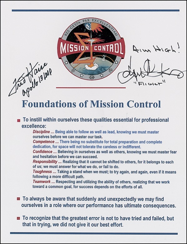Lunar module pilot for the ill-fated Apollo 13 mission. Three items: two color satin-finish photos, one 8 x 10 and one 10 x 8, signed in blue and black felt tip respectively; and a Mission Control Foundations statement, signed in black felt tip by Haise, and also signed by Gene Kranz. In fine condition. COA Scott Cornish and R&R COA.