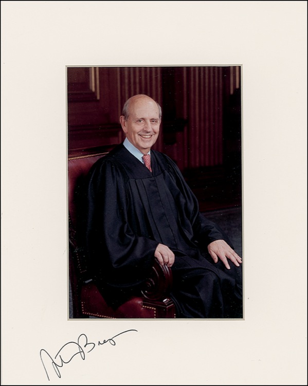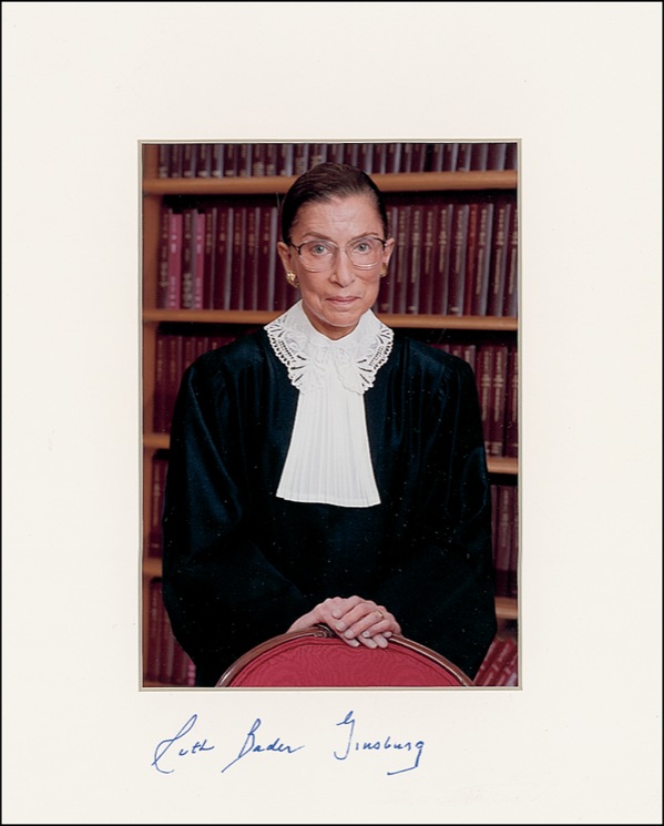 Eight color 4.5 x 6.5 photos of Supreme Court Justices, each individually matted to overall sizes of 8 x 10, and each signed in blue or black felt tip on the mat of the respective Justice pictured. Signers are: Clarence Thomas, David Souter, Ruth Bader Ginsburg, John Paul Stevens, Stephen Breyer, Samuel Alito (ins), Sandra Day O’Connor (ins), and Antonin Scalia (ins). In fine condition. R&R COA.