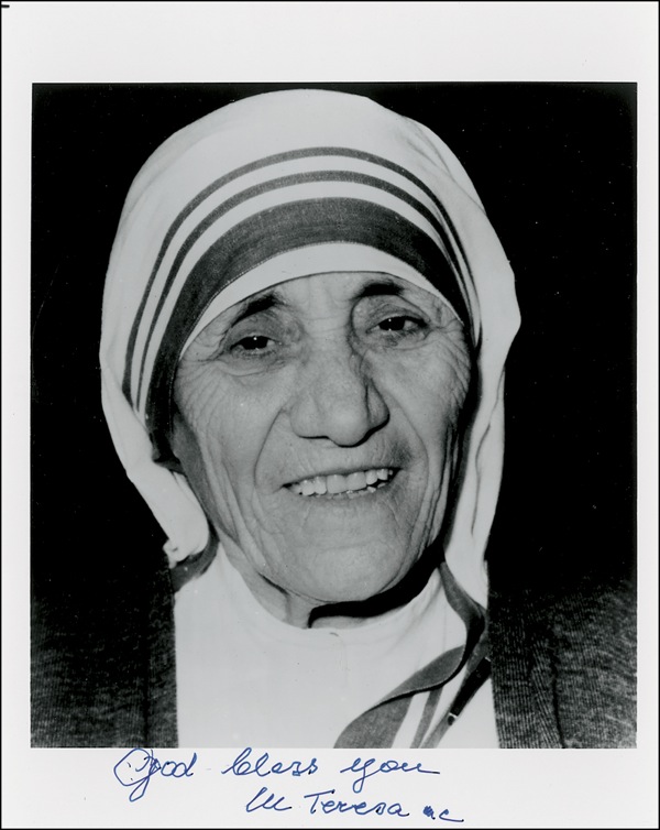 Glossy 8 x 10 photo, signed in blue felt tip “God bless you, M. Teresa MC.” In very fine condition. R&R COA.