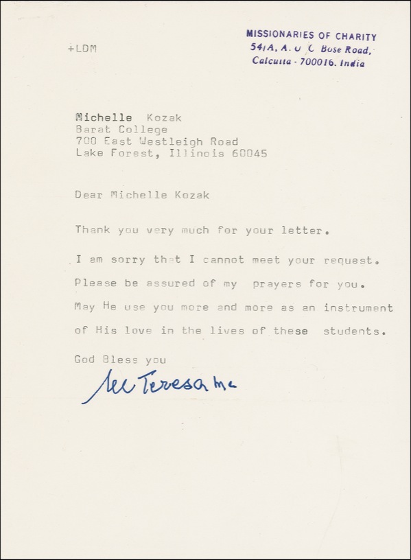 TLS signed “M. Teresa MC,” one page, 5.75 x 7.75, no date [envelope dated in another hand 1993]. Mother Teresa writes to Michelle Kozak at Barat College. In part: “I am sorry that I cannot meet your request. Please be assured of my prayers for you. May He use you more and more as an instrument of His love in the lives of these students….” Accompanied by the original mailing envelope. “Extra” mailing fold lightly touching first letter of signature, otherwise fine condition. R&R COA.