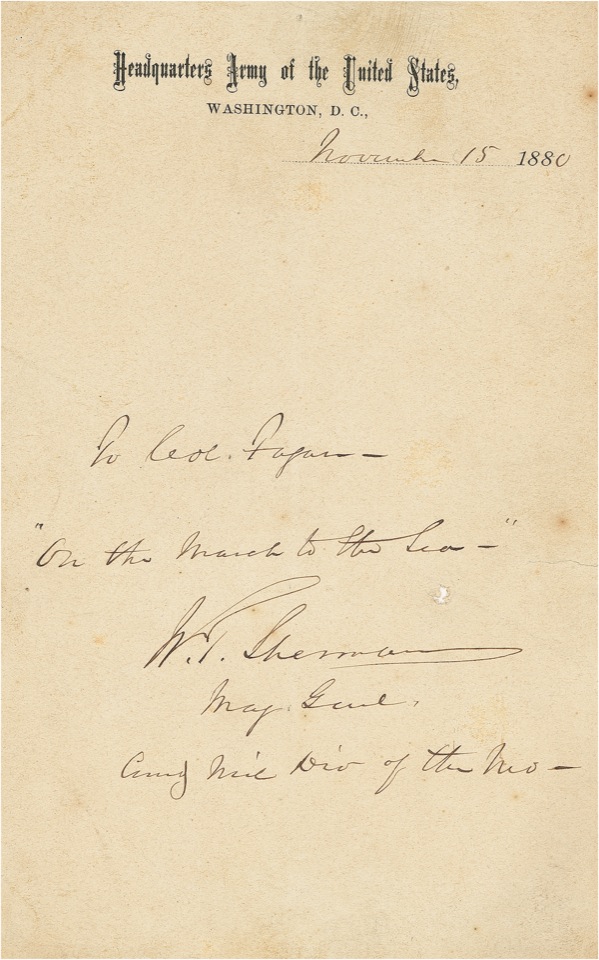 ANS, one page, 4.75 x 7.75, Headquarters, Army of the United States letterhead, November 15, 1880. Sherman writes to Col. Maurice Fagan at the Union League Club in Philadelphia. In full: “‘On the March to the Sea,’ W. T. Sherman, Maj. Genl., Cmdg. Mil. Div of the Mo.” The famous “March to the Sea” began on November 15, 1864, when some 62,000 troops under Sherman’s command departed from recently captured Atlanta. The general’s “scorched earth” policy proved devastatingly effective when, just over a month and 300 miles later, he seized control of Savannah, dealing a crippling strategic and psychological blow to the ever-weakening Confederate forces. Accompanied by the original mailing envelope. In very good condition, with light creases and a faint vertical fold (touching a few letters of signature), light soiling and a few tiny spots, half-inch tear to right margin, and small hole to blank portion of note. The writing is clear and dark throughout. Auction LOA John Reznikoff/PSA/DNA and R&R COA.