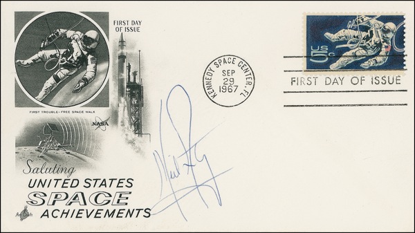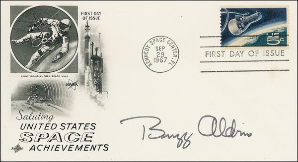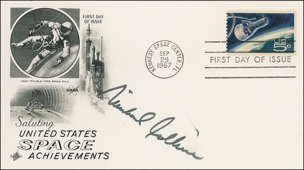 Three identical FDCs, each bearing a cachet honoring United States space achievement, one signed in blue ballpoint by Neil Armstrong, with the other two signed in black felt tip by Buzz Aldrin and Michael Collins respectively. In fine condition, with a touch of trivial toning to Aldrin’s cover, well away from the signature. A superb set of this coveted trio of astronauts. COA Scott Cornish and R&R COA.
