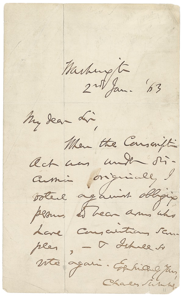 American politician (1811–1874) best known as a Radical Republican and a staunch opponent of slavery. On May 22, 1856, Sumner was famously assaulted and severely beaten in the Senate chamber by South Carolina congressman Preston Brooks, who had taken offense at Sumner’s strongly worded attack on the authors of the Kansas-Nebraska Act—one of whom, Senator Andrew Butler, was Brooks’ cousin. Sumner’s injuries were so severe that he was unable to attend sessions of Congress for the next three years. ALS, one page, 4.75 x 8, January 2, 1863. Sumner writes to an unnamed gentleman. In full: “When the Conscription Act was under discussion originally I voted against obliging persons to bear arms who have conscientious scruples—& I shall so vote again.” A month later, on March 3, Lincoln signed into law the first federal draft in American history, the infamous Conscription Act. The most controversial provision—a “commutation fee” that enabled a draftee to buy his way out of military service by hiring a substitute or paying $300—caused a nationwide uproar. Derided for the patently unfair advantage it afforded wealthy, well-heeled draftees, the act was the direct catalyst for the infamous Draft Riots that rocked New York City over a three-day period in the following July, resulting in $1.5 million in damage and dozens of casualties. Sumner’s direct reference to conscientious objection—for which no exemption was ultimately included in the Act—is quite notable in light of this often-overlooked issue of contention. In very good condition, with intersecting folds, a few tiny tears and chips (tear just touching “u” of last name, chip just touching “r”), and scattered light soiling and wrinkling. The writing is clear and dark throughout. R&R COA.