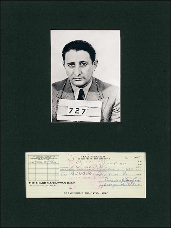 Boss of New York’s most powerful crime family and model for The Godfather. S. G. S. Associates business check, 8.25 x 3.25, filled out in another hand and signed by Gambino, payable to Le Chateau Richelieu for $150.40, June 5, 1962, and countersigned by George Schiller. Matted with a mug shot portrait of Gambino, to an overall size of 12 x 16. Expected holes and stamps, with an additional stamp over Gambino’s last name, otherwise fine condition. R&R COA.