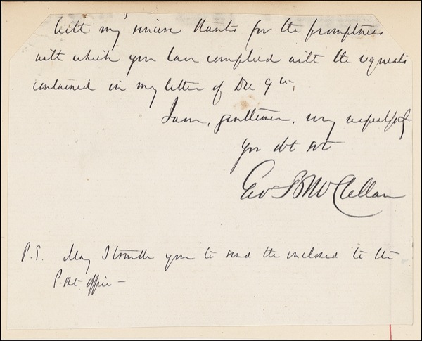 Union general who was removed from command by Lincoln for failure to continue pressure on Lee’s army during the crucial Peninsula Campaign. Partial ALS signed “Geo. B. McClellan,” one page on a 5.25 x 3.5 slip affixed to a slightly larger card, no date. The closing of a letter to unnamed recipients. In part: “With my sincere thanks for the promptness with which you have complied with the requests contained in my letter of Dec 9th, I am, gentlemen, very respectfully, Your obt. svt….” Letter is affixed to a slightly larger off-white card. Mild scattered soiling and faint rippling, otherwise fine condition. R&R COA.