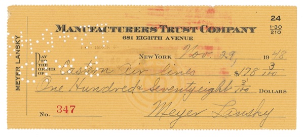 Legendary organized crime leader. Lansky was the godfather of the national crime syndicate that emerged in the early 1930s as successor of the warring Prohibition gangs as well as the old-line Mafia. Forming friendships and alliances with Lucky Luciano and Bugsy Siegel, Lansky directed Murder, Inc. Personal check, 6.5 x 2.75, filled out and signed by Lansky, payable to Eastern Airlines for $178.03, November 29, 1948. During the 1940s, Lansky associate Bugsy Siegel persuaded the crime bosses (including Lansky) to invest in a lavish new casino hotel project in Las Vegas, the Flamingo. On June 20th, 1947, Bugsy Siegel was shot and killed in Beverly Hills, California. Twenty minutes after the Siegel hit, Lansky's associates, including Gus Greenbaum and Moe Sedway, walked into the Flamingo Hotel and took control of the property. According to the FBI, Lansky was to retain a substantial financial interest in the Flamingo for the next twenty years. In fine condition, with expected bank stamps and cancellation holes, and a trivial brush to first letter of last name of signature. Auction LOA John Reznikoff/PSA/DNA and R&R COA.