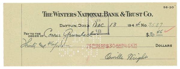 Bank check, 8.5 x 3, filled out in another hand and signed by Wright, payable to Carrie Grumbach [the Wright family’s longtime housekeeper] for $30.46, December 13, 1944. Usual punch cancellations and vertical fold (away from signature), otherwise fine, clean condition. R&R COA.