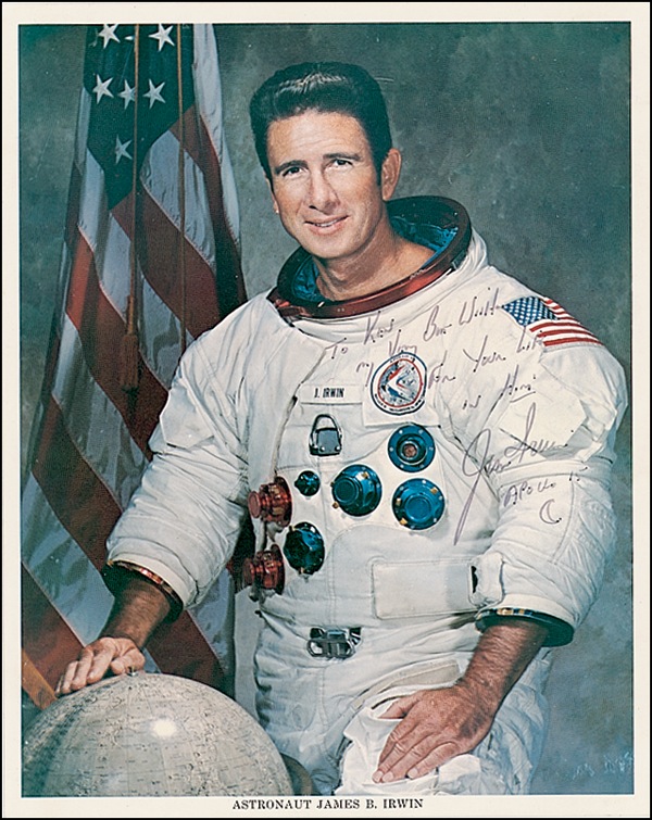 Color 8 x 10 NASA photo of Irwin posing in his spacesuit, signed and inscribed in black felt tip “To Ken, My very best wishes for your life in Him. Jim Irwin, Apollo 15.” In fine condition, with signature and inscription a couple shades light due to inadequate ink flow. COA Scott Cornish and R&R COA.