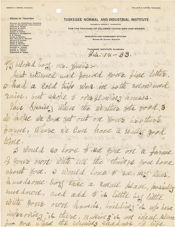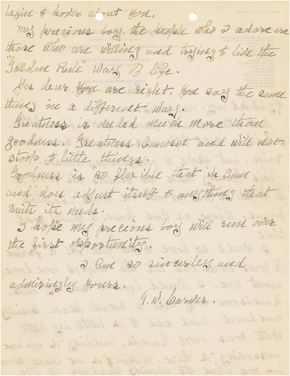 Self-educated African-American botanist (circa 1864–1943) who became a leading expert in agricultural science, most notably relating to the cultivation and practical uses of the peanut. ALS signed “G. W. Carver,” one page both sides, 8.5 x 11, Tuskegee Institute letterhead, February 14, 1933. Carver writes to Mr. Davis. In part: “This spring when the weather gets good, I do hope we can get out on your brother’s farm, where we can have a really good time. I would so love to see you on a farm of your own with all the things you love about you. I would love to see my dear, handsome boy take a small place, possibly rundown, and add to it little by little with your own hands, building it up here, improving it there, making it an ideal place for you when the waning shadows of life begin to hover about you. My precious boy, the people who I adore are those who are willing and trying to live the ‘Golden Rule’ way of life…. Greatness is needed much more than goodness. Greatness cannot and will not stoop to little things. Goodness is so flexible that it can and does adjust itself to anything that suits its needs. I hope my previous boy will run over the first opportunity….” Two file holes at top edge (lightly touching one word), light intersecting mailing folds (vertical fold to one letter of last name) and faint show-through of text, otherwise fine condition. R&R COA.