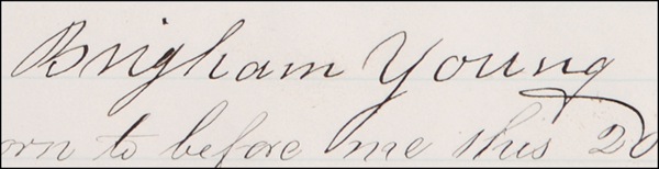 Religious leader (1801–1877) who became leader of the Mormon Church in 1844 after its founder, Joseph Smith, was shot and killed by a mob of angry opponents. A charismatic and powerful leader, Young led the mass migration of Mormons to the Great Salt Lake Valley in Utah, establishing the church’s stronghold in that state. By the time of Young’s death, the Mormon population in Utah had reached 140,000, and the leader’s own legacy included 27 wives and 56 children. In December 2006, a panel of scholars and historians assembled by Atlantic magazine included Young in the roster of the “100 Most Influential Americans of All Time.” Manuscript DS, five pages on three faintly lined sheets, 8.5 x 14, April 20, 1876. A detailed legal complaint filed in the Third District Court, Salt Lake County, wherein Young, as plaintiff, seeks to foreclose on some property owned by Frederick and Margaret Mitchell for non-payment of a promissory note. Signed at the conclusion of the last page. A touch of mild soiling and handling wear, otherwise fine condition. Auction LOA John Reznikoff/PSA/DNA and R&R COA.