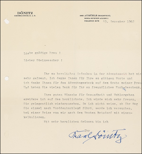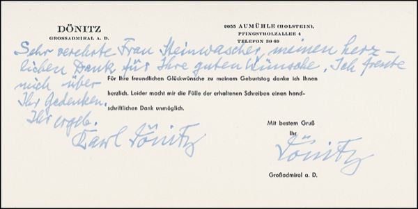 German admiral (1891–1980) who commanded the German navy during World War II and tendered Germany’s surrender to the Allies on May 7, 1945. He was later sentenced to ten years’ imprisonment at Nuremberg. Two items: untranslated TLS in German, signed in full; and a printed card with a handwritten addition in German by Dönitz, signed twice (once as “Dönitz”). In fine condition, with intersecting mailing folds (touching first letter of signature) and file holes to TLS. R&R COA.