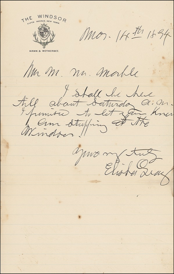 Electrical engineer (1835–1901) whose “caveat” describing the invention of a telephone was delivered to the U.S. Patent Office just hours before Alexander Graham Bell’s epochal patent application for a similar device, touching off a protracted legal dispute, at the end of which Bell was declared the “victor.” Gray’s other inventions include a proto-fax machine that was exhibited at the 1893 World’s Columbian Exposition. ALS, one page, 5.75 x 9, Windsor Hotel, New York letterhead, March 14, 1894. Gray writes to Mr. M. M. Marble. In full: “I shall be here till about Saturday A.M. & promise to let you know. Am stopping at the Windsor.” Accompanied by the original mailing envelope. In very good condition, with scattered light staining and creases, and light handling wear. R&R COA.