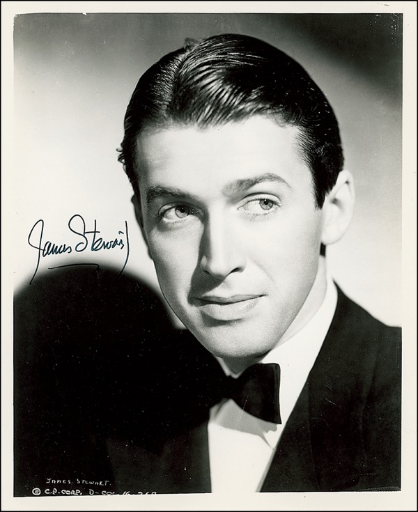 Glossy 8 x 10 photo of a younger Stewart in a jacket and bow tie, signed in black felt tip, “James Stewart.” In fine condition, with a diagonal crease through center of image, and several creases to facial area. R&R COA.