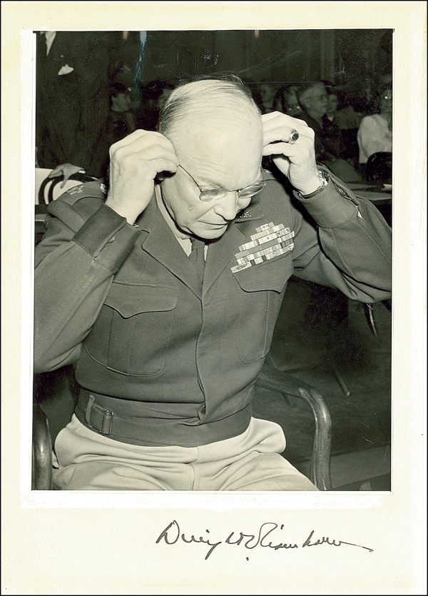 Vintage glossy 6.75 x 8.5 photo affixed to a heavy ivory 8 x 11.25 sheet, a candid image of a uniformed Ik/e adjusting his glasses, boldly signed in fountain pen on the mount. In very good condition, with scattered toning and rippling to mount, lighter area around image from where a previous photo resided, and rippling, dings, and surface marks to photo. Auction LOA John Reznikoff/PSA/DNA and R&R COA.