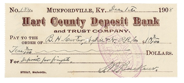 Confederate general (1823–1914) best remembered for submitting to Grant’s famous demand for unconditional surrender at the Battle of Fort Donelson. After the war, Buckner served as Governor of Kentucky, and, in 1896, as the unsuccessful vice-presidential candidate on the “Gold Democrats” ticket. Bank check, 6 x 2.5, filled out and signed by Buckner as “S. B. Buckner,” payable to B. H. Carter for $10.00, December 1, 1908. Spindle hole and tear to central portion, and bank stamp touching last name, otherwise fine condition. R&R COA.