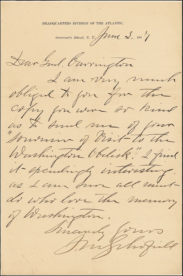 Union general (1831–1906) who served as army commander in Sherman’s Atlanta campaign and who later became General in Chief of the army. ALS signed “J. M. Schofield,” one faintly lined page tipped to a larger card, 6 x 9, Headquarters, Division of the Atlantic letterhead, June 3, 1887. Pope writes to General Carrington. In full: “I am very much obliged to you for the copy you were so kind as to send me of your ‘Souvenir of Visit to the Washington Obelisk.’ I find it exceedingly interesting as I am sure all must do who love the memory of Washington.” Intersecting mailing folds (vertical fold through “M”), otherwise fine, fresh, crisp condition. R&R COA.