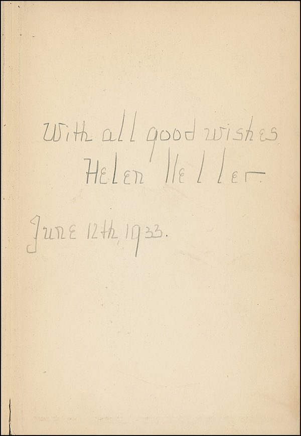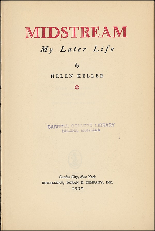 Signed book: Midstream: My Later Life. Garden City: Doubleday, Doran & Company, 1930. Hardcover, 6.25 x 9, 362 pages. Signed in pencil on the front free end page “With all good wishes, Helen Keller, June 12th, 1933.” In very good condition, with ex-library markings and labels to interior and spine, front hinge split (but intact), sunning to spine, and light wear to extremities. R&R COA.