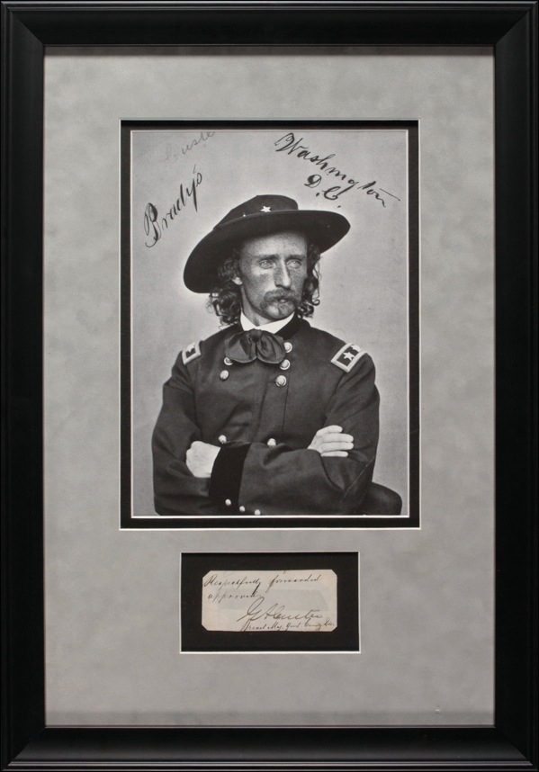 A Civil War general and Indian fighter, Custer (1839–1876) distinguished himself as a cavalry commander, earning the rank of brigadier general of volunteers at age 23. Following the Civil War he became field commander of the 7th Cavalry and led troops in a number of engagements during the Indian Wars. Custer, together with all of the men under his immediate command, was killed at the Battle of Little Bighorn on June 25, 1876. Bold ink signature, “G. A. Custer,” on an off-white 3.25 x 1.25 slip clipped from a document endorsed by Custer. Double suede matted and framed with an impressive portrait of Custer in uniform, to an overall size of 12.75 x 18.5. The slip is tape-affixed to mat board (light show-through of tape touching about half of “G” and top third of “A” and “C”), and corners are clipped, otherwise fine condition. Auction LOA John Reznikoff/PSA/DNA and R&R COA.
