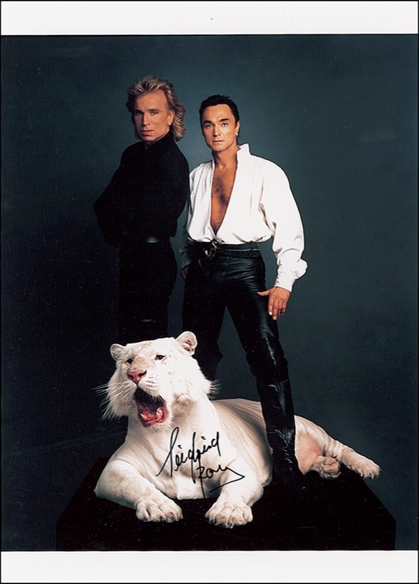 Color glossy 10 x 14 photo of the famous magicians posing with one of their white tigers, signed in black felt tip. In very fine condition. R&R COA.