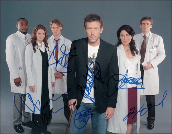 Color satin-finish 14 x 11 photo, signed in blue felt tip by Hugh Laurie, Jennifer Morrison, Jesse Spencer, Omar Epps, Robert Sean Leonard, and Lisa Edelstein. In very fine condition. R&R COA.