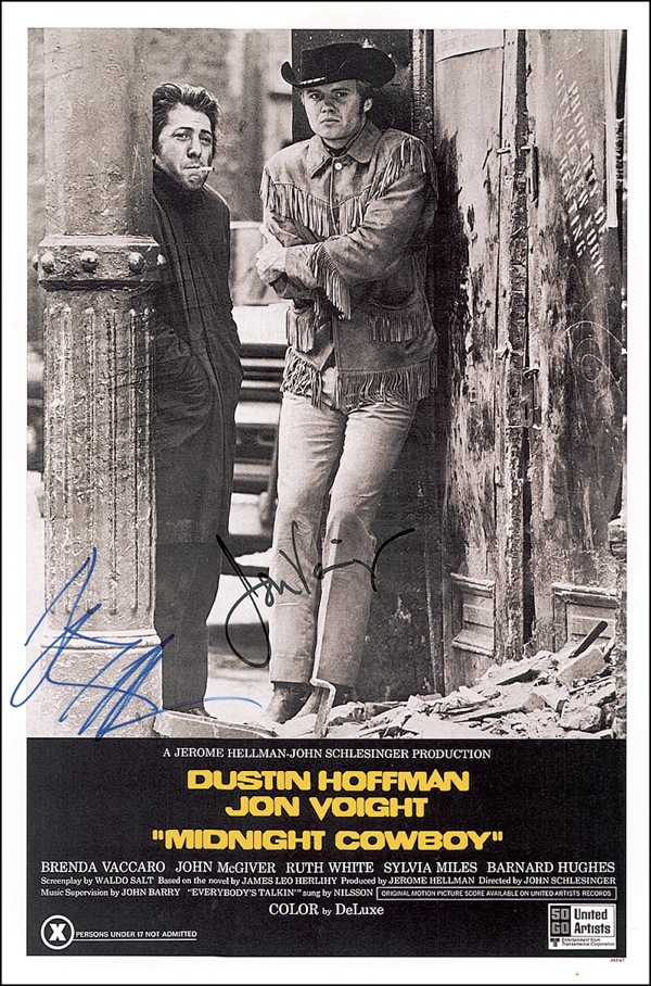 Mini-poster for Midnight Cowboy, 11 x 17, signed in blue felt tip by Dustin Hoffman and in black felt tip by Jon Voight. In fine condition. R&R COA.