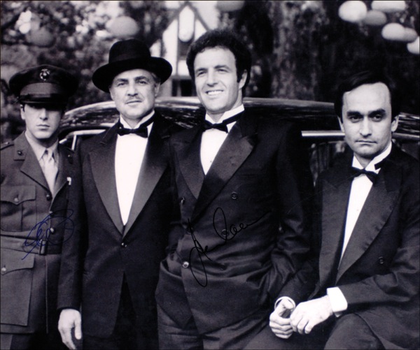 Satin-finish 20 x 16 photo of Don Corleone posing with his three sons, Michael, Sonny, and Fredo, signed in blue felt tip by Al Pacino and in black felt tip by James Caan. Rolled and in very fine condition. R&R COA.