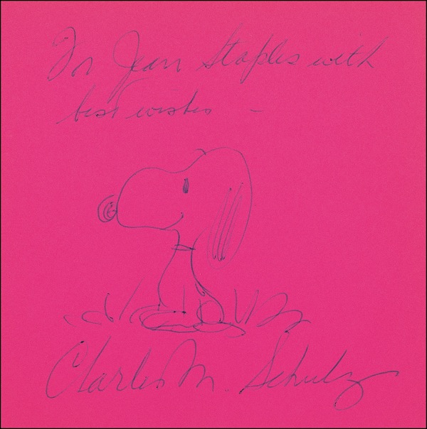Signed book: Happiness Is A Warm Puppy. San Francisco: Determined Productions, 1962. Hardcover, 5.5 x 5.75. Signed and inscribed in blue ballpoint on the first free end page, “To Jean Staples, with best wishes, Charles M. Schulz,” with Schulz adding a nice full-length sketch of Snoopy sitting in some grass. In fine condition, with some light wear and soiling to covers. R&R COA.