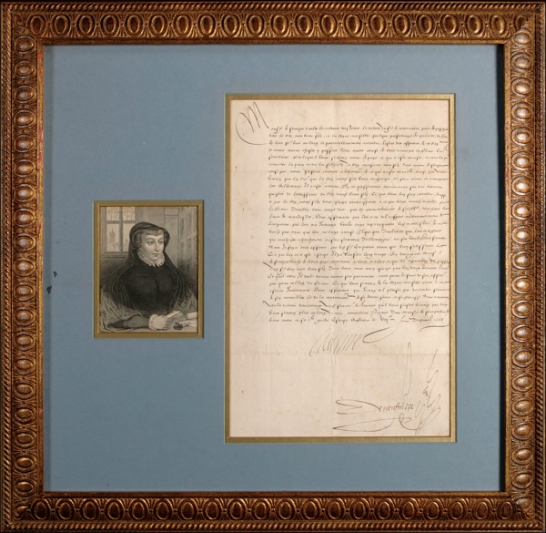 Queen Consort of France (born Florence, 1519) from 1547 to 1559 and mother of three French kings: Francis II, Charles IX, and Henry III. Manuscript DS in Old French, signed “Catherine,” one page, 8.25 x 12.5, 1568. An untranslated document or official letter mentioning “peace between subjects” and “L’Allemagne” [England]. Countersigned by another official. Matted and framed with an antique engraving to an overall size of 21 x 20.5. In very good condition, with intersecting folds (lightly touching signature), scattered faint foxing and staining, and a hint of mild wrinkling. R&R COA. Oversized.