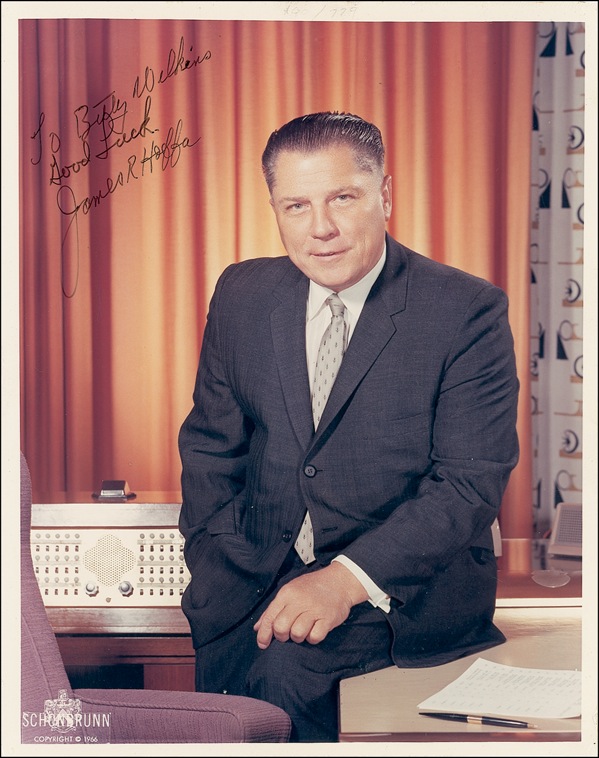 Storied, charismatic, and controversial American labor leader (1913–1975?) who attained his greatest notoriety when he vanished on July 30, 1975. The truth behind his presumed demise and the whereabouts of his remains take a place among the most durable mysteries in modern American history. Color glossy 8 x 10 photo of Hoffa sitting on his desk, signed and inscribed in black felt tip, “To Betty Wilkins, Good luck, James R. Hoffa.” Tiny corner bends and a few unobtrusive surface marks, otherwise fine condition. R&R COA.