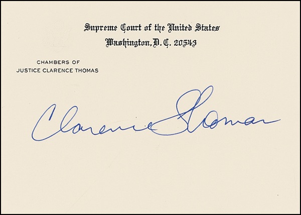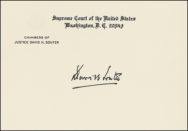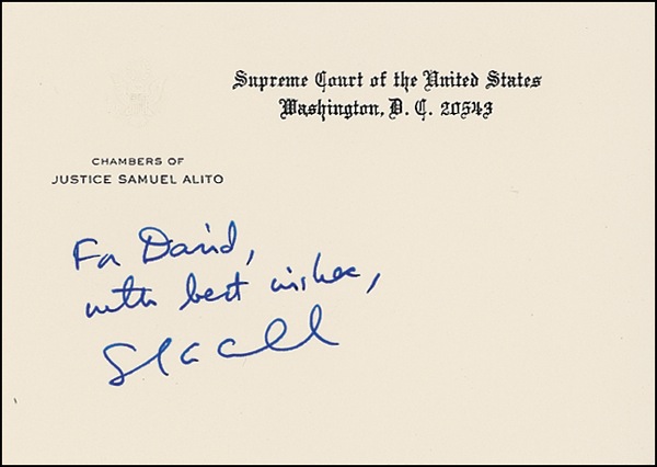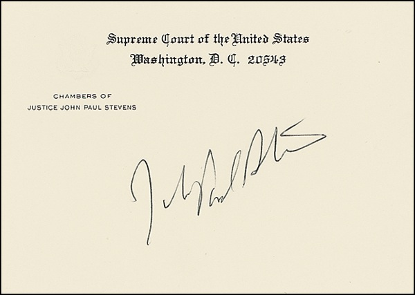 Five signed Supreme Court chamber cards, 5 x 3.5, each signed in ink or ballpoint by a different justice. Signers are: John Paul Stevens, Clarence Thomas, David Souter, Samuel Alito (ins), and Ruth Bader Ginsburg. In very fine condition. R&R COA.