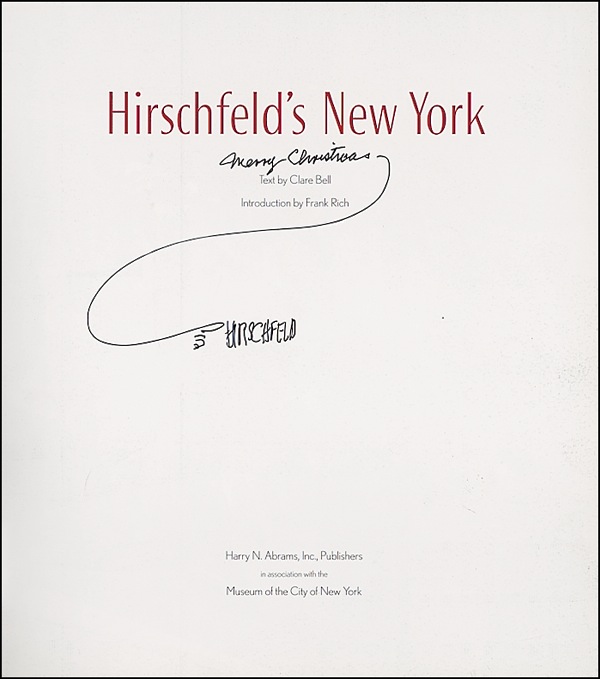 Signed book: Hirschfeld’s New York. NY: Harry N. Abrams, Inc., 2001. Softcover, 9 x 10, 96 pages. Signed on the title page in black ink, “Merry Christmas, Hirschfeld.” In very fine condition. R&R COA.
