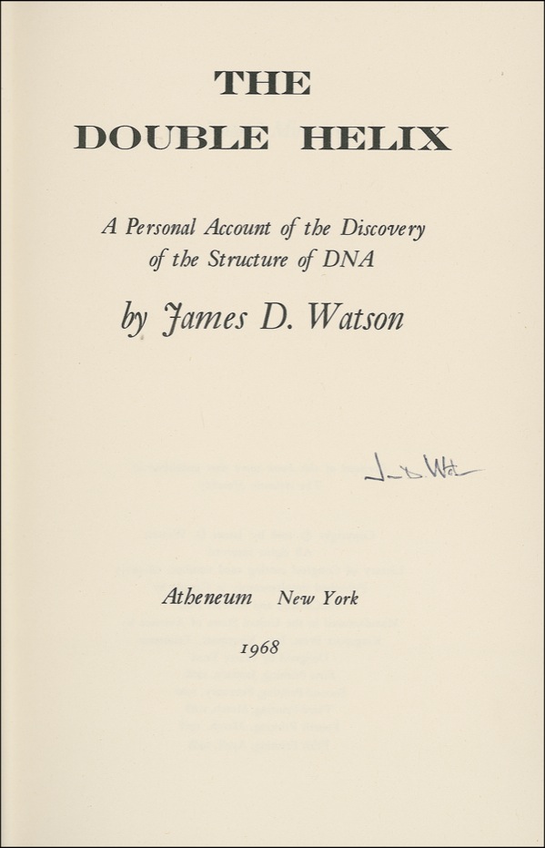 American biologist (born 1928) who shared the 1962 Nobel Prize in Medicine for discovering the function and structure of DNA, providing the prime impetus for further research in the emerging fields of molecular genetics and biochemistry. Signed book: The Double Helix. NY: Atheneum, 1968. Hardcover, 5.5 x 8.75, 226 pages. Signed in ballpoint on the title page. Previous owner’s ink name, ink notation to bottom edge, and light wear and a few tears to jacket, otherwise fine condition. R&R COA.