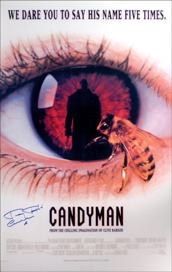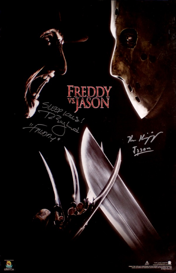 Five horror film posters, ranging in size from 22 x 33 up to 27 x 40, each signed in felt tip or ink by the film’s respective star(s). Signers are: Linda Blair (The Exorcist); Tony Todd (Candyman); Doug Bradley, Nicholas Vince and Simon Bamford (Hellraiser); Robert Englund and Ken Kirzinger (Freddy vs. Jason); and Gunnar Hansen (Texas Chainsaw Massacre). Accompanied by photos of Englund and Kirzinger taken at time of signing. Rolled and in fine overall condition, with some scattered light edge wear, dings, and small tears. R&R COA.