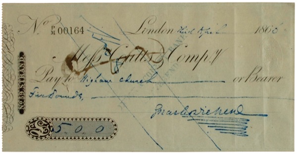 Business check, 7.25 x 3.75, filled out and signed by Dickens, payable to Higham Church for £5.0.0, April 3, 1866. The check has been mounted or inlaid to a larger sheet. Accompanied by a CDV of Dickens and a vintage suede-bound copy of A Christmas Carol. Framed to an overall size of 9.5 x 6. In fine condition overall, with light vertical folds (touching a few letters of signature), pen cancellations touching two letters, a hint of subtle soiling, and spindle hole to blank portion. The signature is dark and clear. Auction LOA John Reznikoff/PSA/DNA and R&R COA.