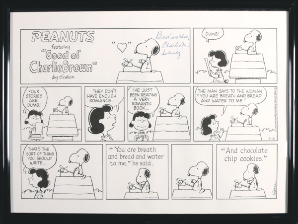 Black and white print of a 1986 Peanuts strip featuring Lucy and Snoopy in his guise as novelist, 23 x 17, signed in ballpoint “Best wishes, Charles M. Schulz.” Framed to an overall size of 25 x 19. In fine condition. R&R COA. Oversized.