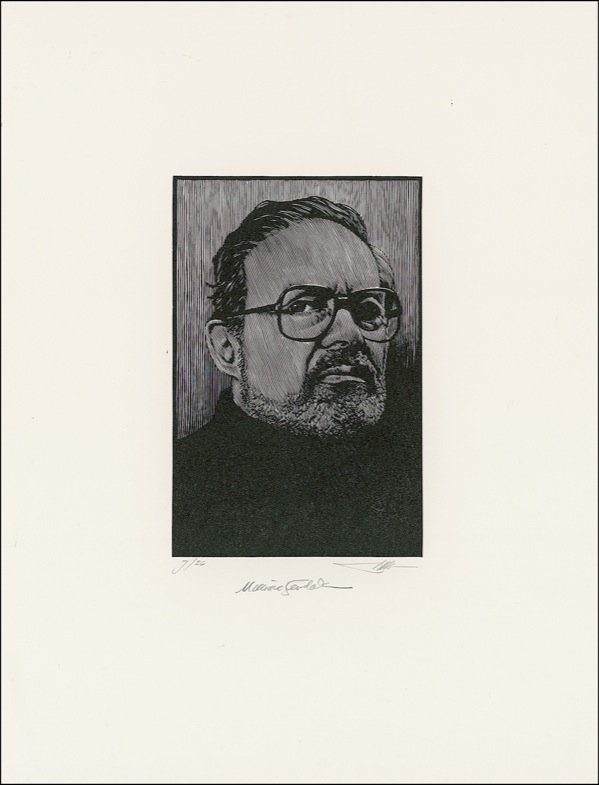 Popular author and illustrator (born 1928) of such children’s classics as Where the Wild Things Are and In the Night Kitchen. Striking limited edition wood engraving of Sendak by Barry Moser, #7/26, the image measuring approximately 4 x 6 on an off-white 9.5 x 12.5 sheet, signed in pencil beneath the image “Maurice Sendak” and additionally signed and numbered by Moser. In very fine condition. R&R COA.